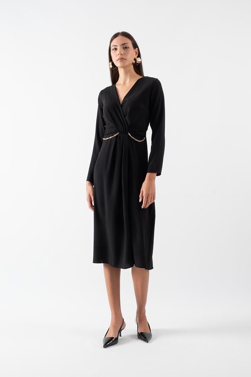 Damaso V Yaka Beli Pileli Zincir Detaylı Elbise SİYAH (51000244)