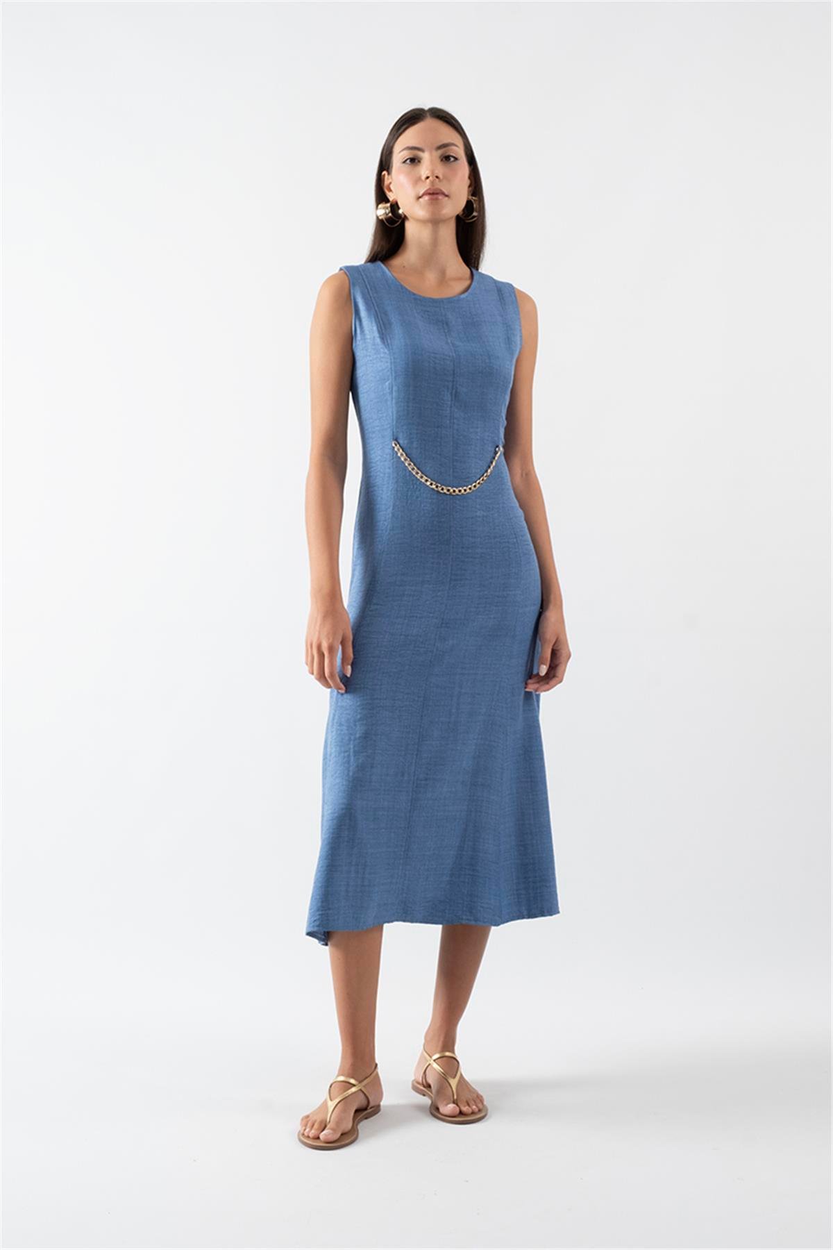 Eldard Yuvarlak Yaka Belde Zincir Detaylı Elbise İNDİGO (51000259)