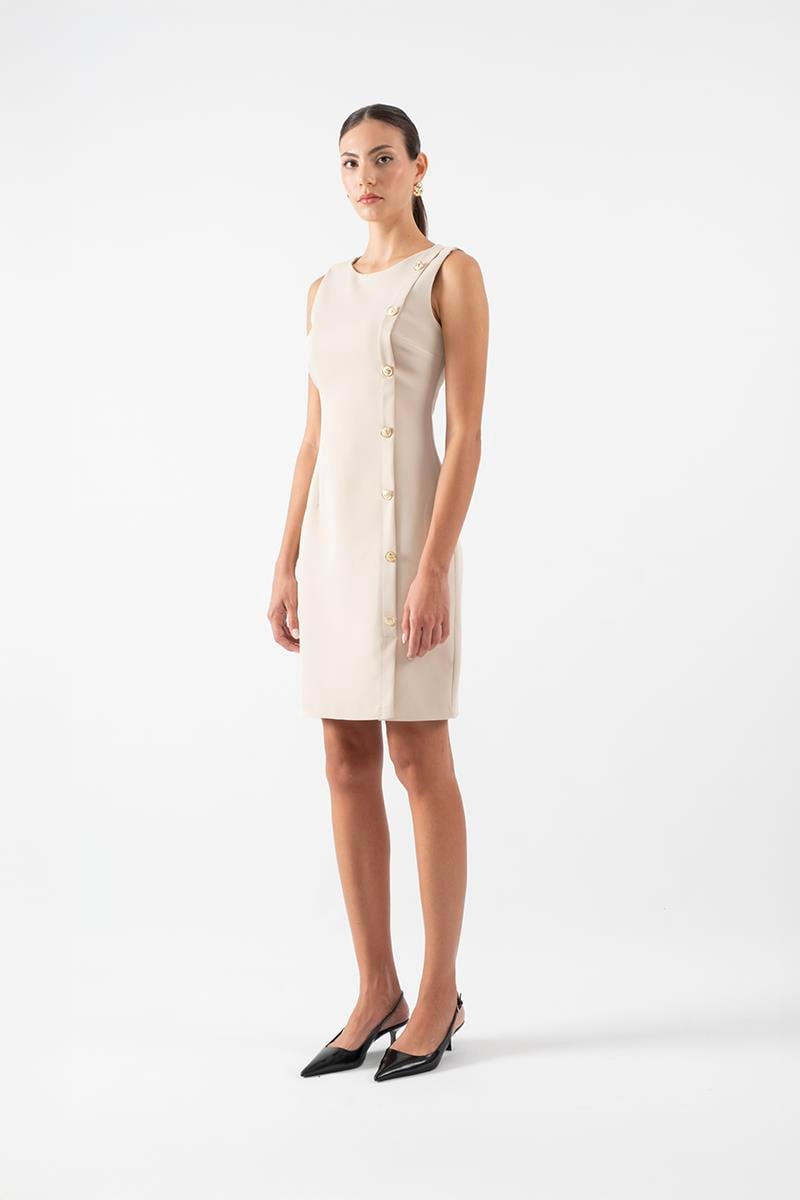 Reevers Yuvarlak Yaka Düğme Detaylı Elbise BEJ