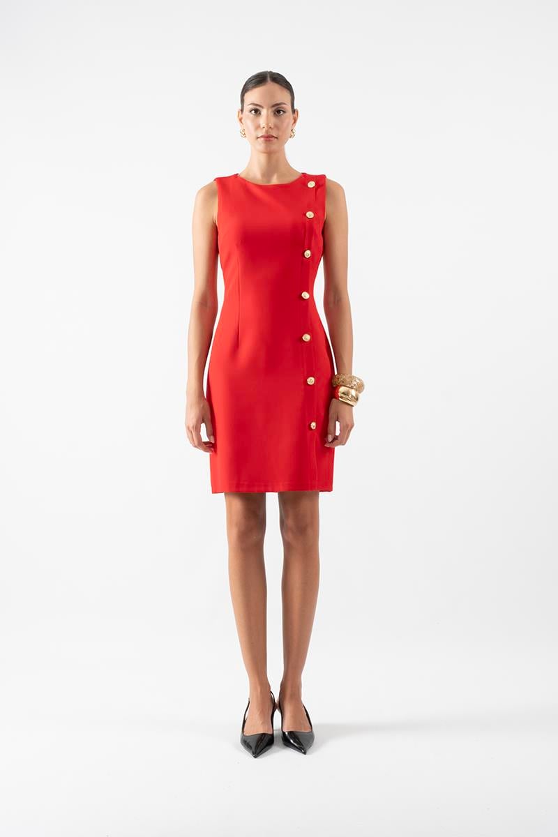 Reevers Yuvarlak Yaka Düğme Detaylı Elbise KIRMIZI